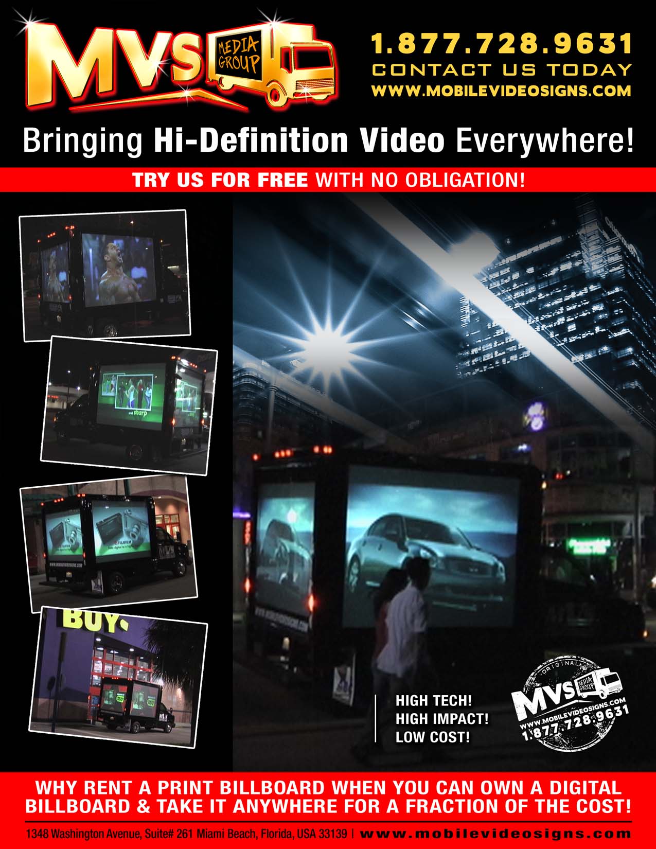 MVS HQ: Suite 261 1348 Washington Ave. Miami Beach, Florida USA 33139 Tel: 1.877.728.9631 Fax: 786.866.7772 info@mobilevideosigns.com